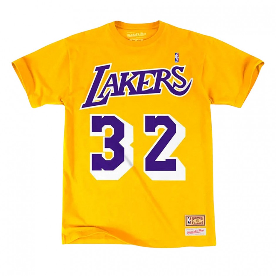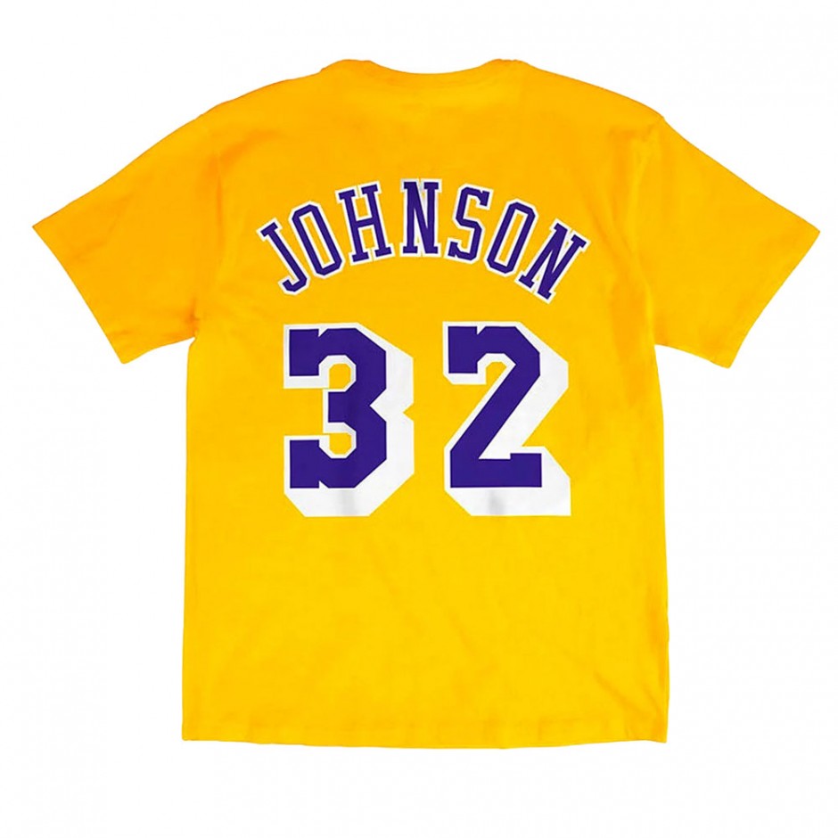 - Discover the Mitchell & Ness NBA T-shirt featuring the name and number of Magic Johnson and the Los Angeles Lakers logo in yellow.