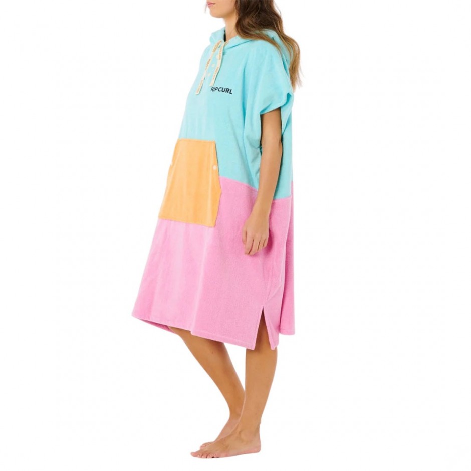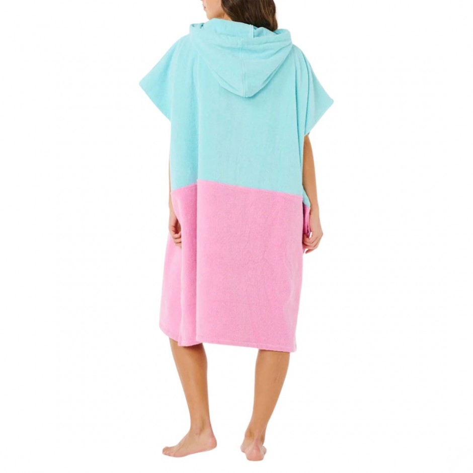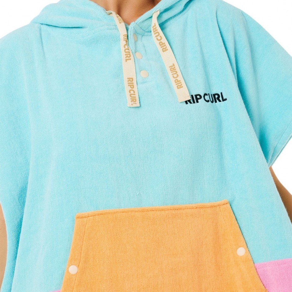 - Women's Rip Curl Premium Surf Hooded Poncho in light sea blue color designed for comfort and authentic surf lifestyle.