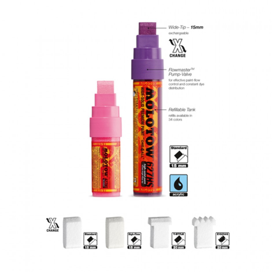 The pocket-sized 427HS and the 627HS are perfect for large area applications. The biggest markers of the ONE4ALL™ series are equipped with an impressive 15mm broad-tip and are available in 18 colors.For both markers there are four exchange tips available: the 15mm standard-tip, the 15mm high-flow-tip, the 20mm T-style tip and the 20mm ZigZag effect- tip.