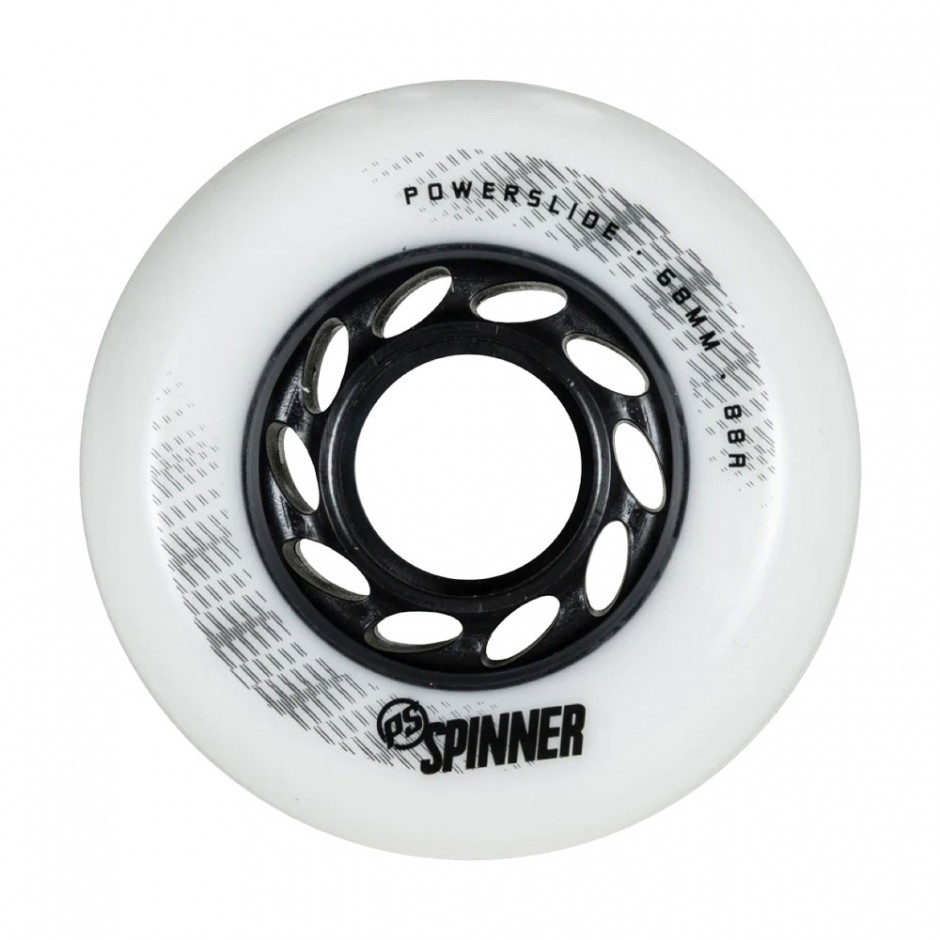 - POWERSLIDE Spinner ροδάκια inline skating σε λευκό χρώμα, σχεδιασμένα για υψηλές επιδόσεις.